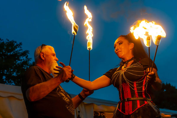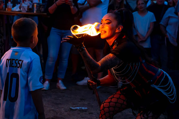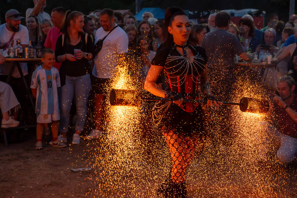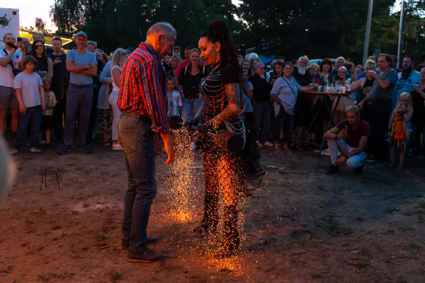 Danke den vielen kommerziellen Anbietern, die auf dem Festplatz für Speis und Trank sorgten. Danke für das Unterhaltungsangebot für unsere Kinder. Danke an die Kinder und Erzieher unserer Kita Schneckenhaus für den wunderbaren Auftritt im Festzelt. Und danke auch den Linedancern Berlin/Brandenburg sowie dem Akkkordeonorchester. Danke den Betreibern der bunten Marktstände, egal ob kommerziell, gemeindlich oder ehrenamtlich. Danke an das Team von Heppe-Event, das mit starker Musik strahlende Gesichter und einen ständig gut gefüllten Tanzboden garantierte. Unterbrochen nur durch die exotische Feuershow, bei der manch Zuschauer einbezogen wurde und das Feuer aus allernächster Nähe mitentfachen oder einfach nur erspüren konnte.